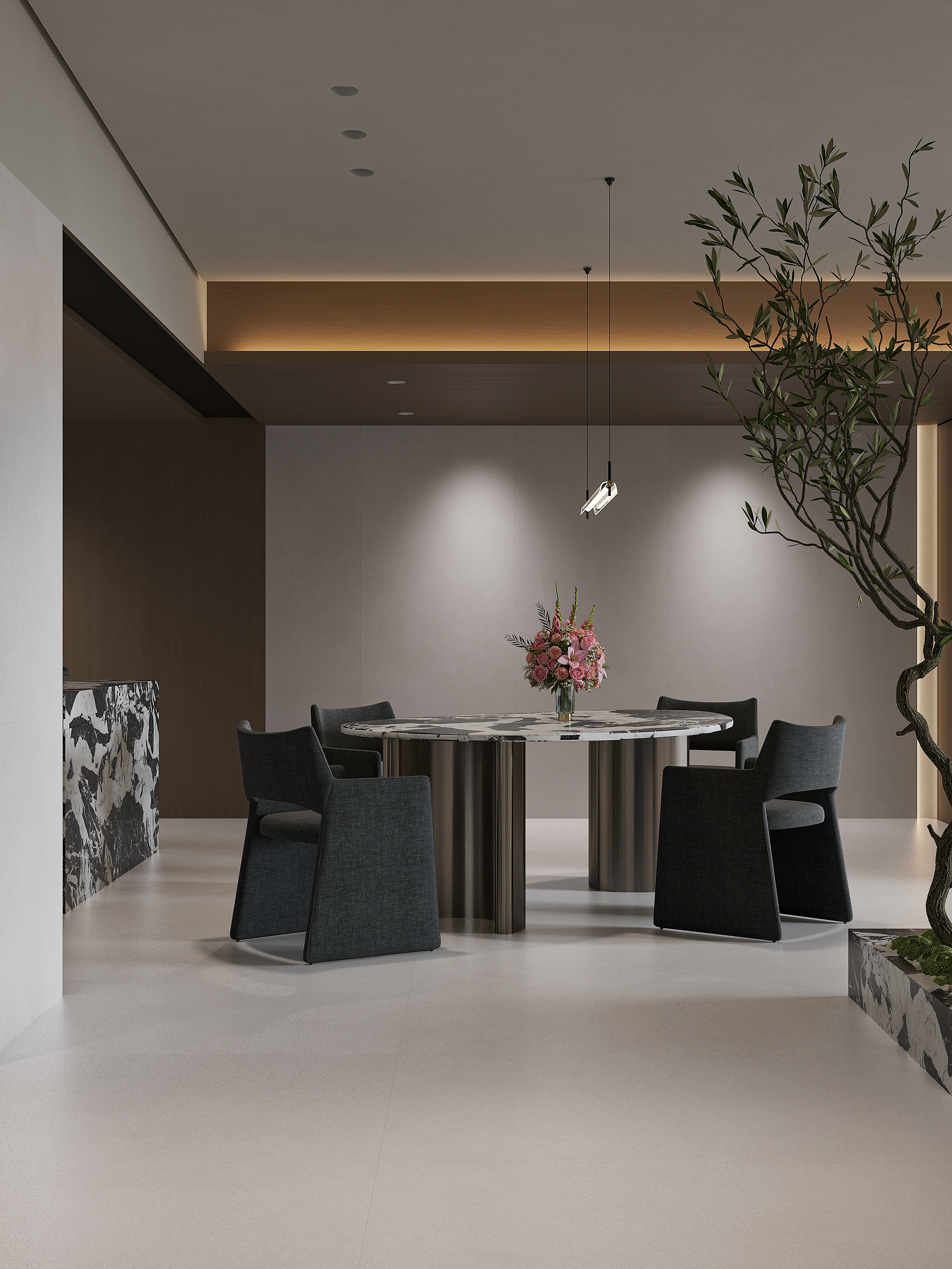 以莱姆石为素材,将现代人对自然及珍稀石材的渴望,融入到瓷砖设计中,从肌理、光感、触感、色彩、工艺,对产品进行多维度人文重塑,探寻时光的印迹,再造别致温婉的表面触感。